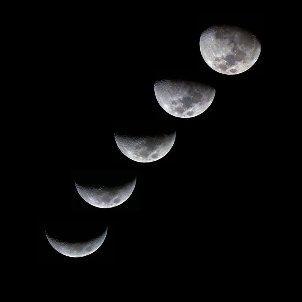 月の満ち欠けは、月が地球の周りを回る動きと、月が太陽の光を反射している、というふたつのことが関係しています。月の明るく見える部分は、太陽の光が照らしている部分です。月が欠けている部分は、影になっているので見えません。月の位置によって、太陽の光を受ける部分が変わるので、地球からみた月は満ち欠けしているよう見えます。月が太陽と同じ方向に位置するとき、地球からは月の明るい部分が見えません。これが「新月」で、「朔」とも言います。新月から3日目の夕方に見える細い月を「三日月」といい、26日目頃の明け方に見える細い月を「明けの三日月」または「有明月」といいます。太陽と月が空でどれだけの角度を移動したかを示す値「黄経差」が約90度になると、「上弦の月」として地球から月の西半分が明るく見えます。逆に「下弦の月」では月の東半分が光ります。そして太陽の反対側、つまり180度移動して丸く光り輝くのが「満月」です。満月になるのは新月から15日目ぐらいで、「十五夜の月」ともいいます。その前後、13日目の月を「十三夜月」、16日目の月を「十六夜月」といいます。月の満ち欠けの形は、月、地球、太陽の位置関係によって変わります。太陽は自ら光を発する恒星で、地球は太陽の周りを公転する惑星、月は地球の周りを公転する衛星と呼ばれています。恒星ではない地球や月は、自ら光を発することはしません。これらの天体がどのような角度で位置しているかによって、月のどの部分が太陽の光を反射しているかが決まります。