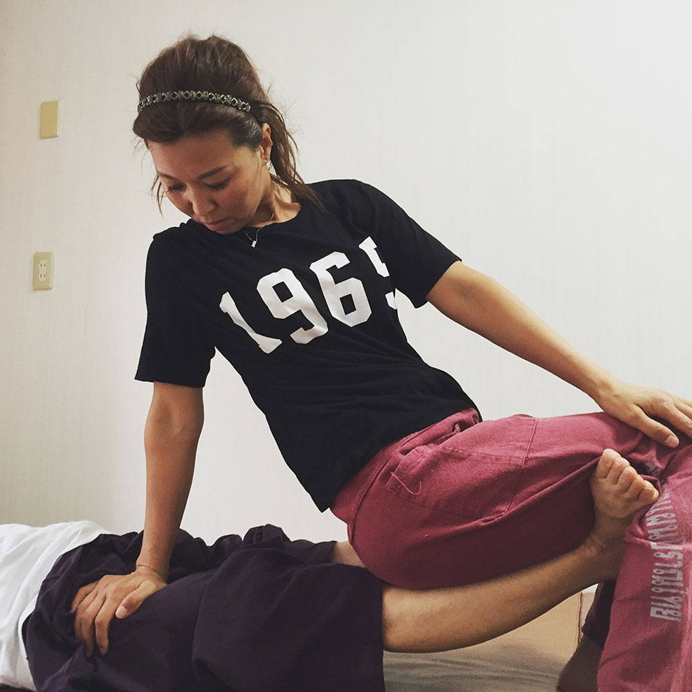 タイ古式マッサージはストレッチテクニックが含まれているのが特徴です。でも、実際には、タイ古式マッサージを志す方たちの中には「ストレッチが苦手だ」と言う人がいます。押圧部分は得意なのですが、ストレッチが苦手だと言う方には、少なからず共通点があります。そこで、ちょっとアドバイスをしたいと思います。ストレッチテクニックを覚えようとする時、「手をここに置いて、足をここに添えて・・・」という覚え方をしてしまうと、自分自身の身体がどうなっているか、重心がどこにあるか・・・については意識していない場合が多いように思われます。つまり、これだと、「身体が全然使えていない」ということになってしまいます。この覚え方では、あくまでも自分が中心になってしまっています。自分を中心に手足をどう動かすかだけを考えていても、当然ながら上達はしません。セラピストは黒子としての存在でなければなりません。ですから、ちょっと意識を変えて、自分と相手をひとかたまりにして、その両方の中心に意識を持っていくことが大切です。自分は相手で。相手も自分で。二人ともがバラバラではなく、つながっている感覚です。わからないかもしれませんね。すみません。表現方法を変えます。ストレッチングにおいて、重心は左右にぶれることなく常に真ん中です。さらに重心を下げて丹田を中心に自分の身体を使います。力まずに力を抜いて、身体を大きく使います。そのためには、歩幅スタンスを広くとってください。上体は左右前後に大きく動いてもOKです。相手にもたれかかるように重心移動しながら行ってください。自分一人で直立できないくらい、相手を信じてもたれかかるようにすることがポイントです。こうすることで、動きがスムーズになり、全体が滑らかにつながります。余計な力が入っていないため、相手の状態も手に取るようにわかります。関節の可動域の限界値も身体から伝わってきます。相手にとってちょうどいいところが、自然に身体で感じられるようになります。