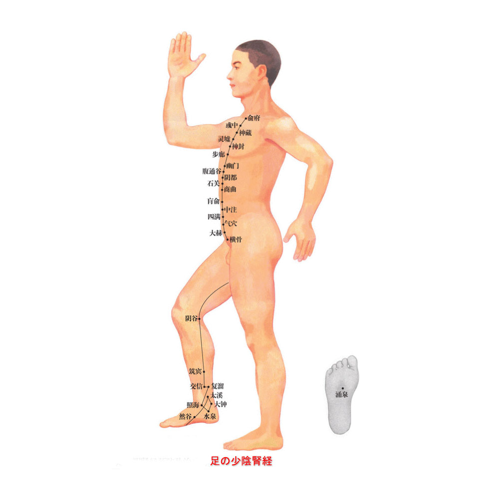 腎につながる少陰の足陰経。足の小指先から起こって、足裏の経穴「湧泉ゆうせん」を通り、内くるぶし、膝、大腿の内側を通って上がり、会陰で2つのルートに分かれます。一方のルートは、会陰から腹、胸、鎖骨下の「愈府ゆふ」で止まります。もう一方のルートは、腎臓でさらに2つのルートに分かれます。ひとつは、肝、横隔膜を貫いて、肺に至り、喉、舌へとつながります。さらにもうひとつは、心につながり、胸中で心包とつながる「手の厥陰心包経」と交わります。このラインは、生殖などの生命活動や老化などと深い関わりを持ち、呼吸困難やふらつき、めまい、焦燥感、腰痛、背痛、下肢の脱力や痛みなどの治療に有効です。 ※人体惑星試論では、水星のエネルギーを受けているラインに相当します。 ※タイのエネルギーライン「セン」では、脚の内側サードラインに相当します。