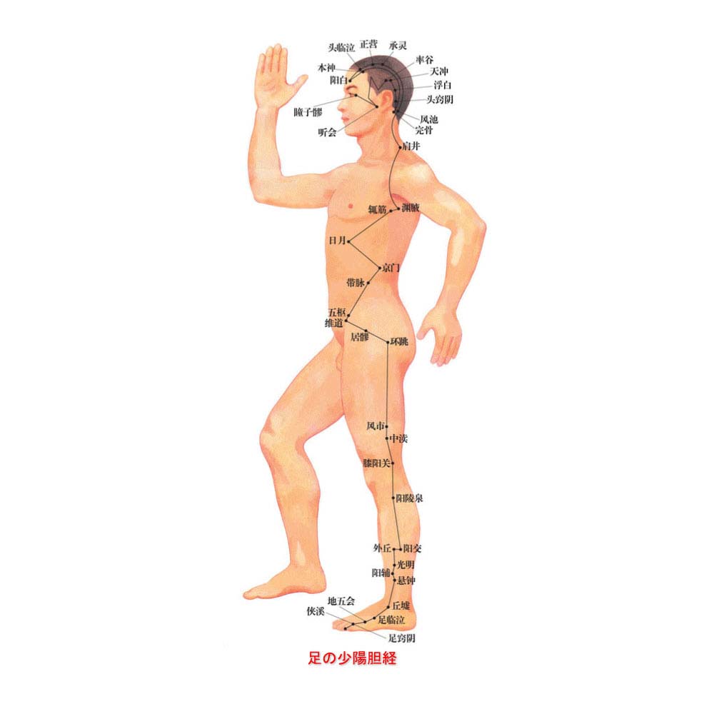 胆につながる少陽の足陽経。目尻から耳を通って、耳の後ろの経穴「完骨かんこつ」を通って耳の後ろで枝分かれします。ひとつのルートは、側頭部を経て首に向かいます。鎖骨でいったん合流してまた枝分かれします。この一方のルートは胸中から肝、胆を通って、そけい部、陰毛の際を通って再び合流します。もう一方のルートは肩の経穴「肩胃けんせい」から、脇、身体の側面を通って、足の外側から外くるぶしを通って、足の薬指に向かいます。足の薬指と小指の間にある経穴「足臨泣あしりんきゅう」から枝分かれしたルートは「足の厥陰肝経」と交わります。このラインは、頭痛や頭部の症状、股、膝の痛みなどの治療に有効です。 ※人体惑星試論では、木星のエネルギーを受けているラインに相当します。 ※タイのエネルギーライン「セン」では、脚の外側セカンドラインに相当します。