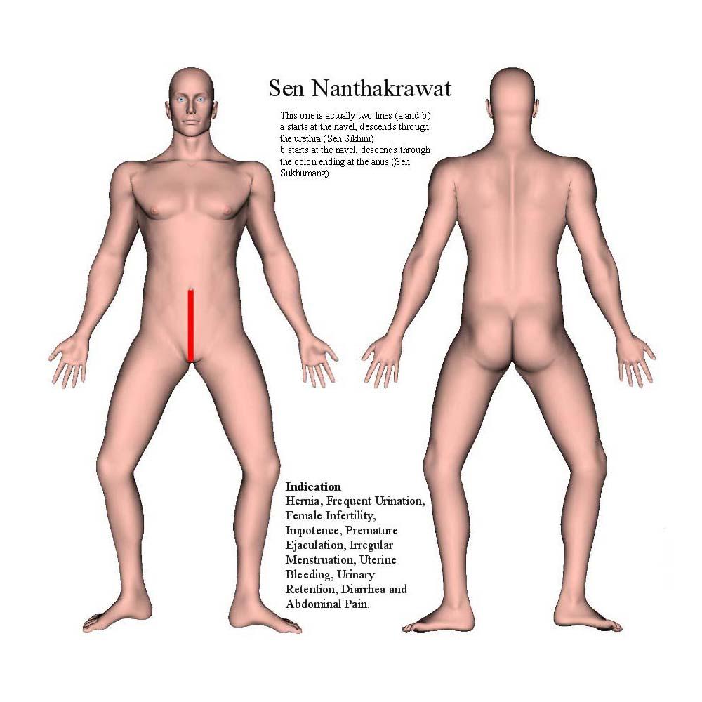 →セン・ピタクン (Sen Pitakun) (男性)へそ~陰茎 →セン.キチャ (Sen Kitcha) (女性)へそ~子宮~膣 [適応症状] ヘルニア、頻尿、不妊症、生理不順、性的不能、早漏、尿閉、下痢、腹痛および性的衝動の安定など